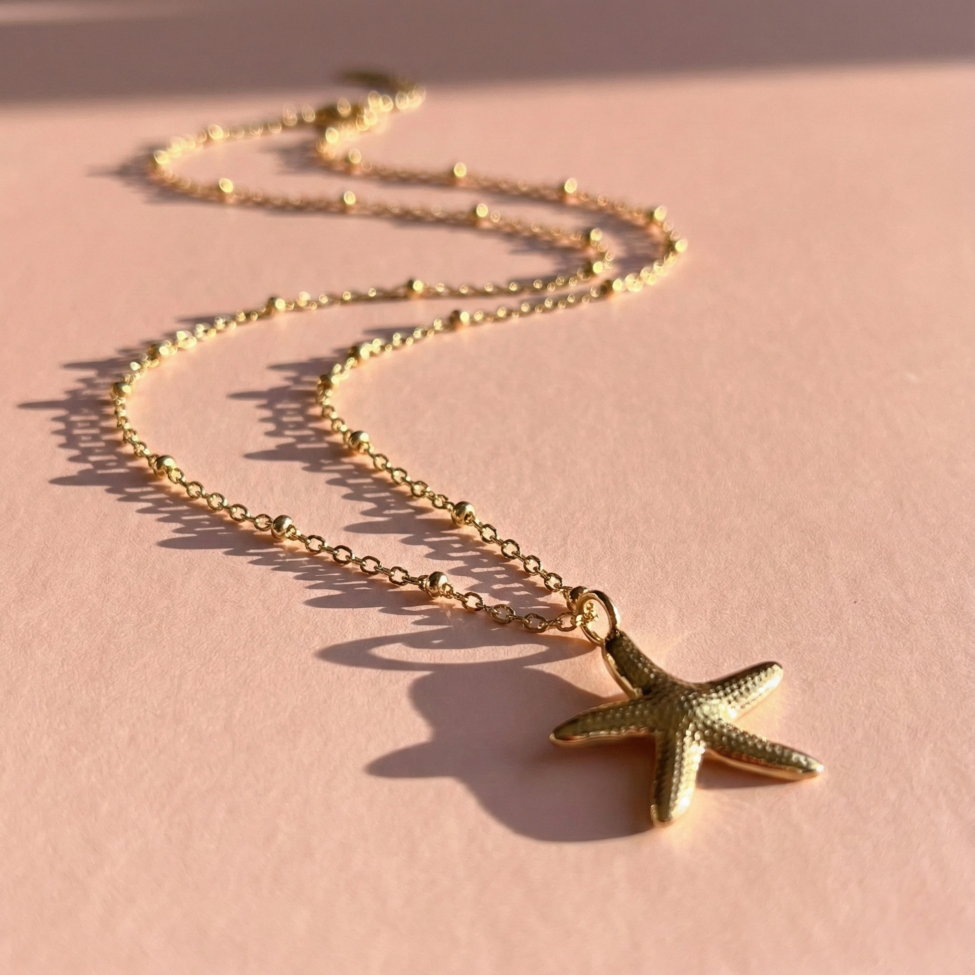 Naszyjnik z rozgwiazdą to hołd dla natury i jej niezwykłych stworzeń. Subtelny łańcuszek z kulkami podkreśla mistyczny charakter tego naszyjnika. Zapięcie regulowane na karabińczyk zapewnia wygodę noszenia, a Ty zyskujesz biżuterię, która sprawia, że każda chwila nabiera wyjątkowego znaczenia. Płyniesz z nami?