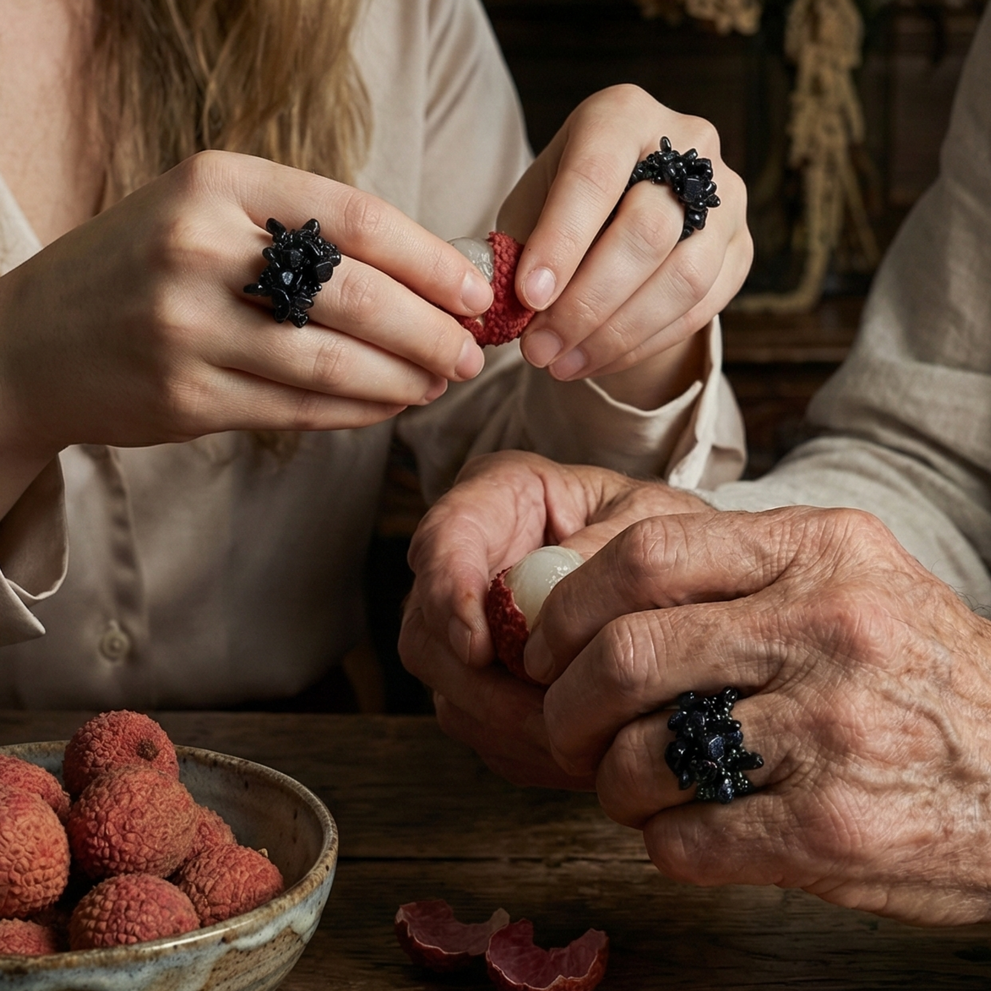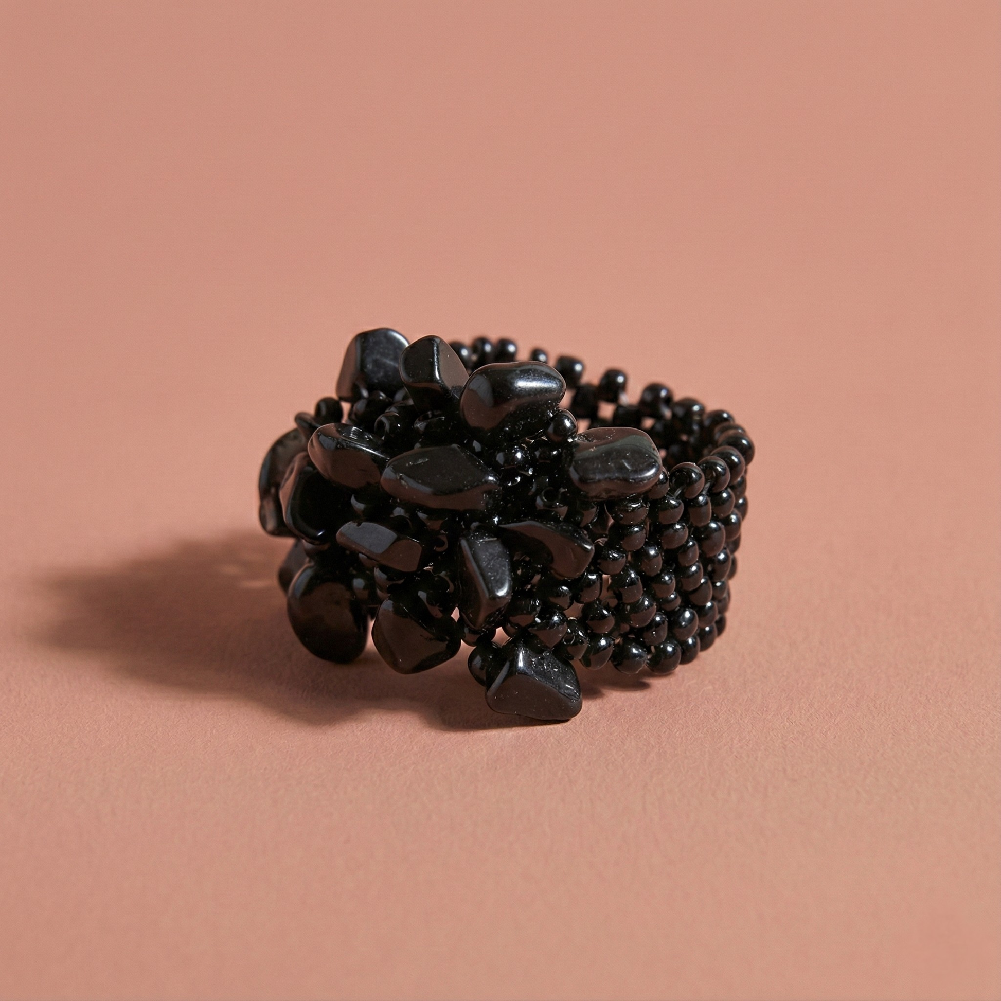 Pierścionek z kamieniami onyksu to biżuteria pełna mocy. Onyks, znany ze swoich właściwości ochronnych, pomaga w koncentracji i spokoju wewnętrznym. Elastyczna gumka zapewnia wygodę, dopasowując się do kształtu palca, co czyni ten pierścionek idealnym do codziennego noszenia.