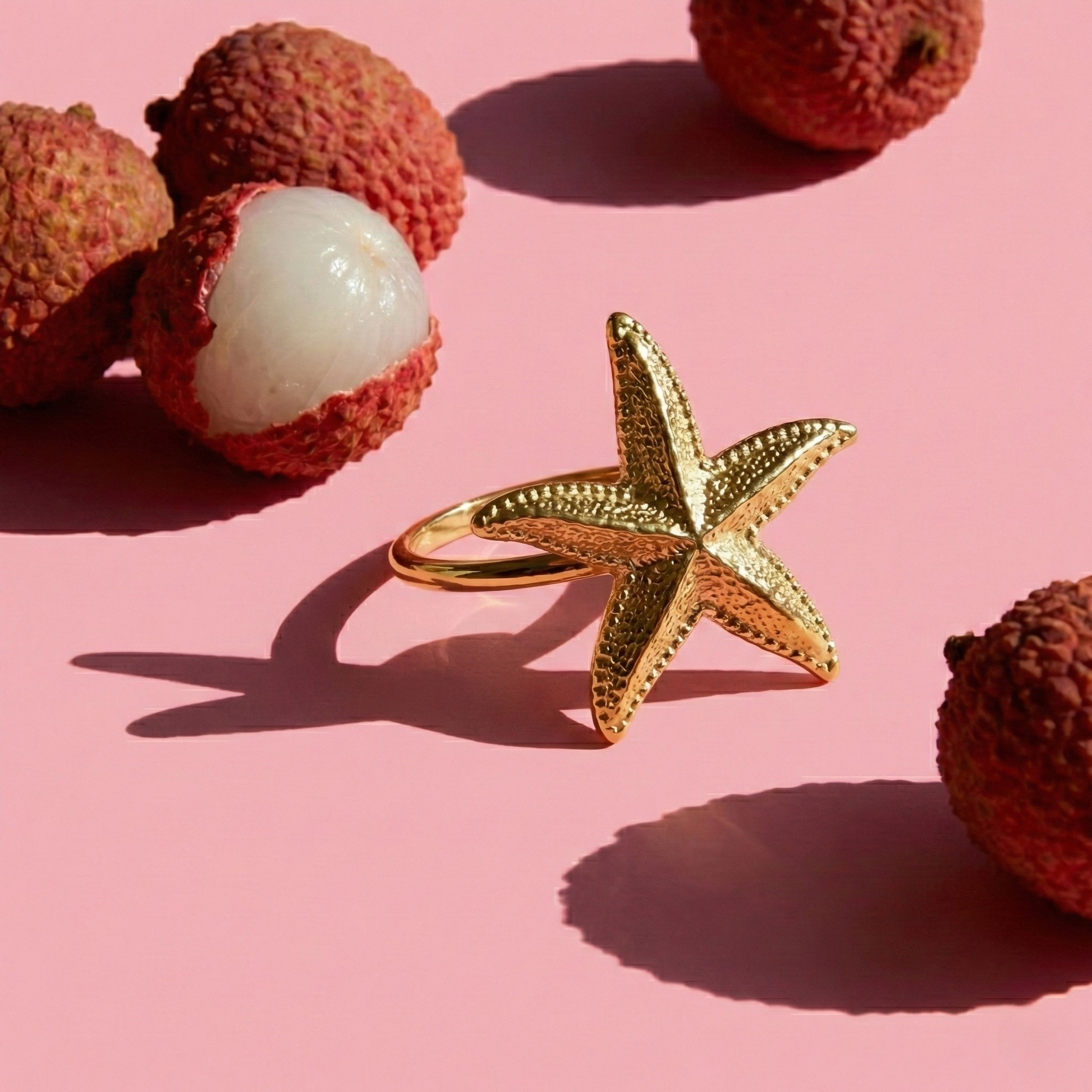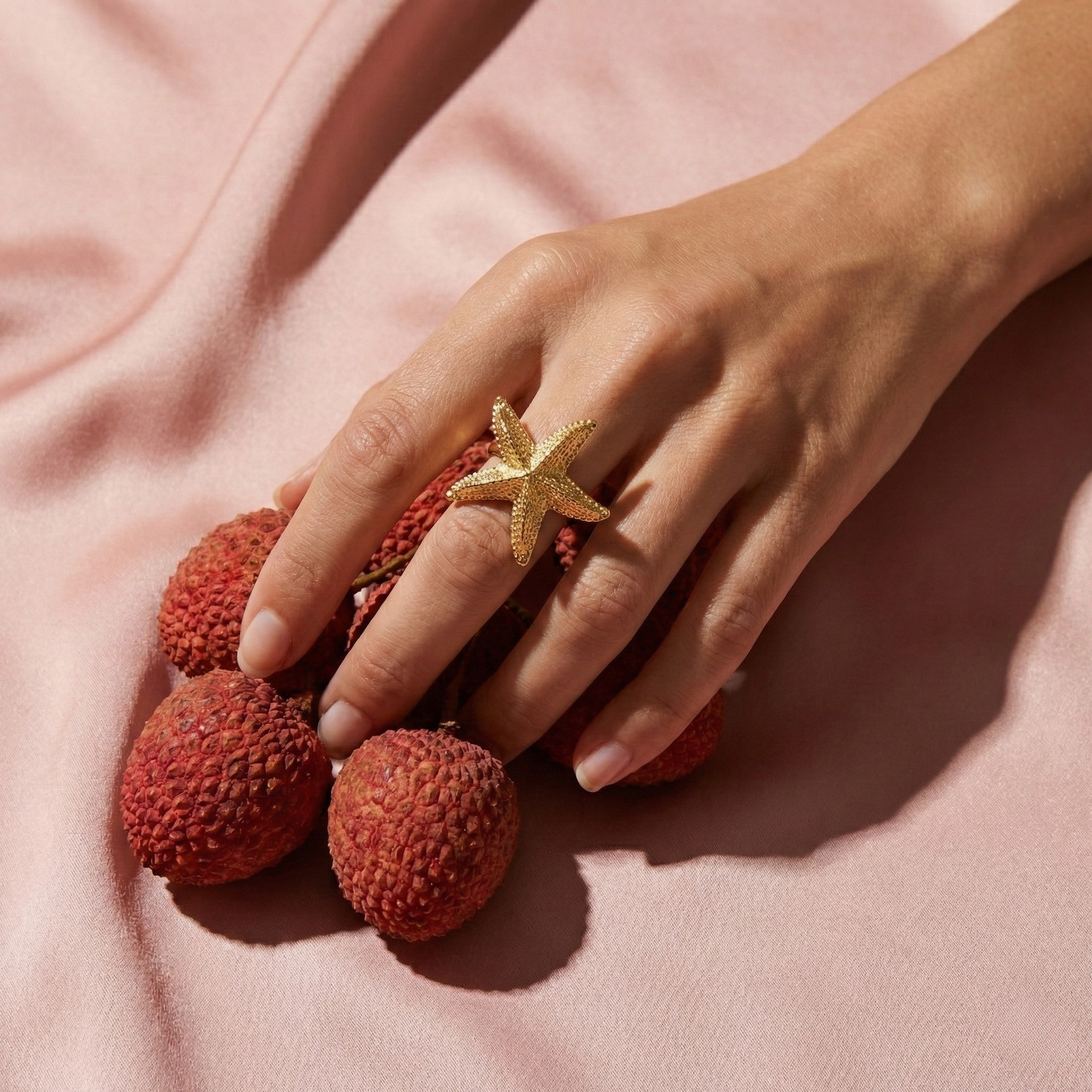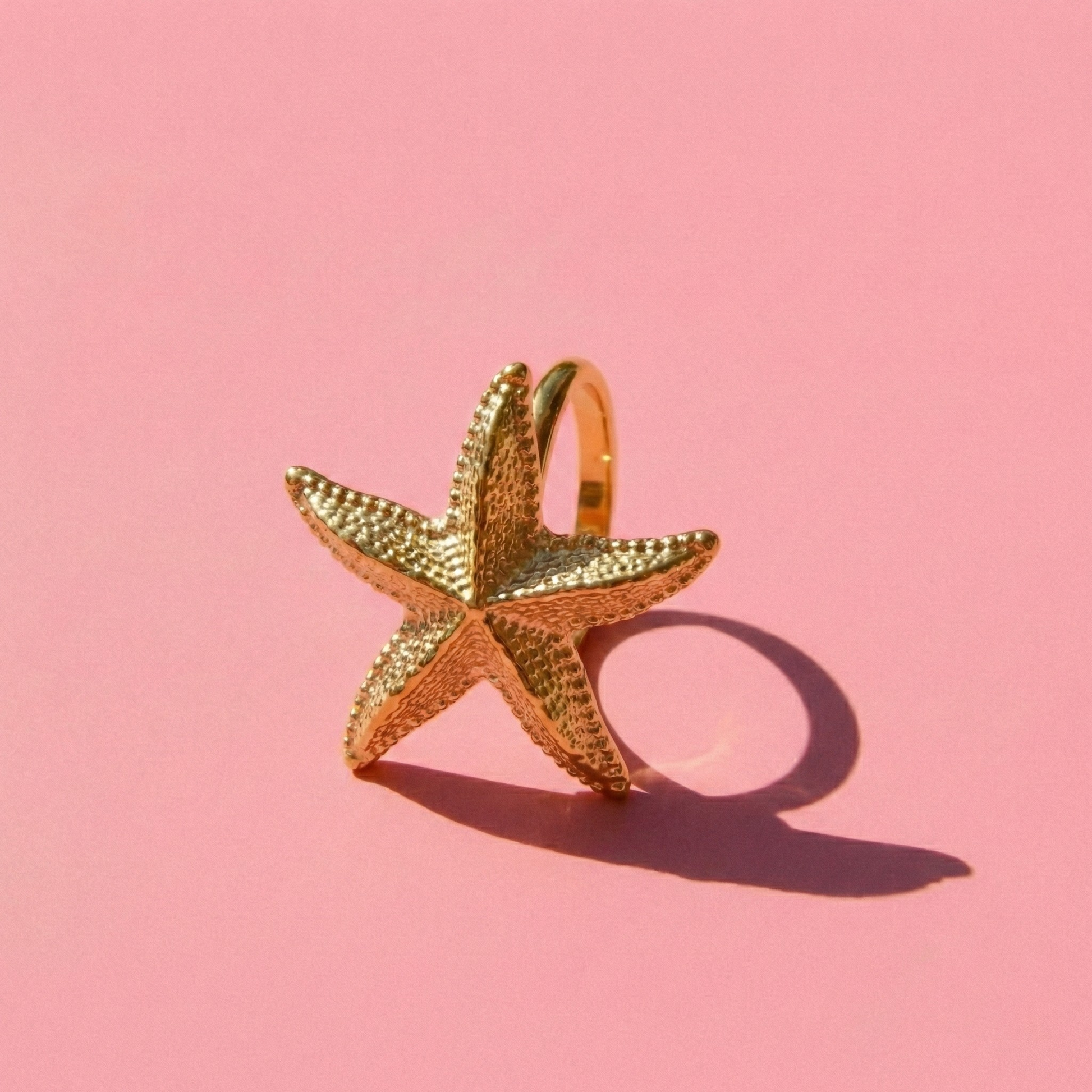 Złocista rozgwiazda o misternie wyczuwalnej strukturze to morska opowieść i szyk w jednym. To biżuteria, która pięknie rozświetla dłoń i przyciąga spojrzenia, zachowując przy tym pełną lekkość formy. Gładka obrączka i precyzyjne wykończenie to gwarancja wygody, która towarzyszy Ci naturalnie w każdym geście.